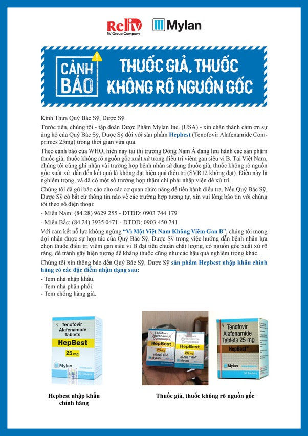 Thuốc Hepbest 25mg (TAF 25mg) đặc trị viêm gan B mạn tính đã xuất hiện hàng giả. Công ty Reliv pharma đã cung cấp thông tin mới nhất cho chúng tôi. Theo đó, Tổ chức Y tế thế giới WHO đã thông báo tại thị trường Đông Nam Á bắt đầu xuất hiện thuốc Hepbest 25mg không rõ nguồn gốc xuất xứ, không đảm bảo chất lượng. Tại thị trường Việt Nam, một số trường hợp dùng phải thuốc Hepbest 25mg giả không đạt được hiệu quả điều trị (SVR 12 không đạt: chỉ số nói lên đáp ứng miễn dịch phải có khi uống thuốc Hepbest 25mg được 12 tuần).