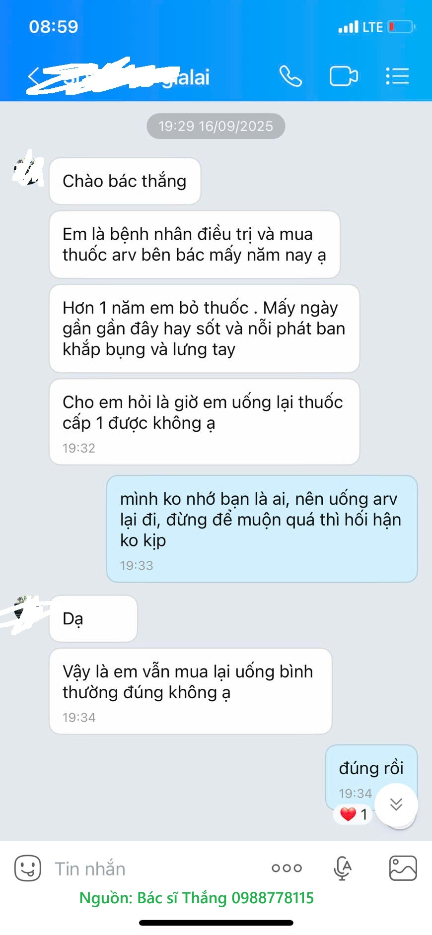 Theo bác sĩ Thắng, trường hợp bạn này có nói là đã tự ý bỏ uống thuốc ARV hơn năm nay. Trước đó, bạn có mua và điều trị ARV bên bác sĩ. Tuy nhiên, bác sĩ cũng không có dữ liệu hay trí nhớ gì về bạn này. Có thể bạn đã từng mua thuốc nhưng cách rất lâu rồi. Hơn nữa, nhiều bạn dùng các tài khoản zalo, số điện thoại khác nhau, thay đổi liên tục. Chỉ biết rằng, bạn muốn hỏi mua ARV để uống lại vì đã ngưng điều trị một thời gian tương đối dài. Vả lại, đợt này thấy cơ thể không khỏe, sốt và phát ban liên tục.