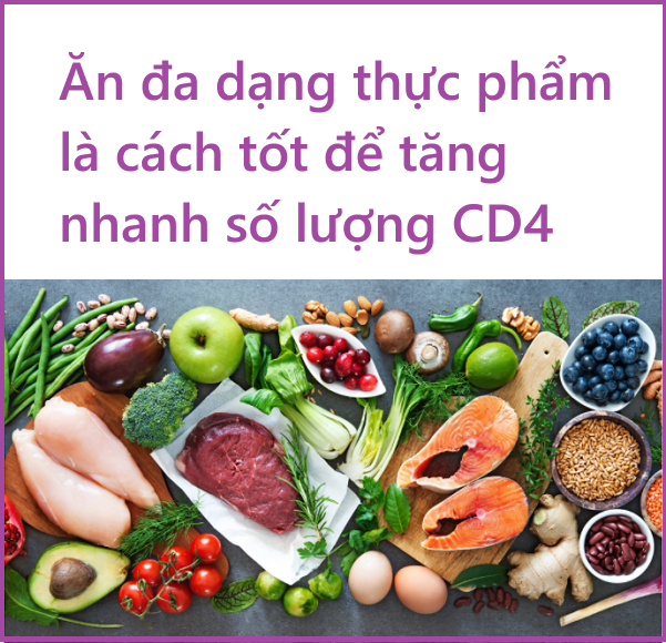 Do đó ăn gì để tăng CD4 chính là phải bổ sung đầy đủ dinh dưỡng thuộc nhiều nhóm thực phẩm khác nhau. Ăn uống lành mạnh, điều độ nhiều bữa một ngày. Không nên ăn quá no mà cũng đừng để quá đói. Ưu tiên những thực phẩm nhiều vitamin như rau xanh, trái cây cùng các loại đạm trắng như thịt gà, cá nước ngọt...
