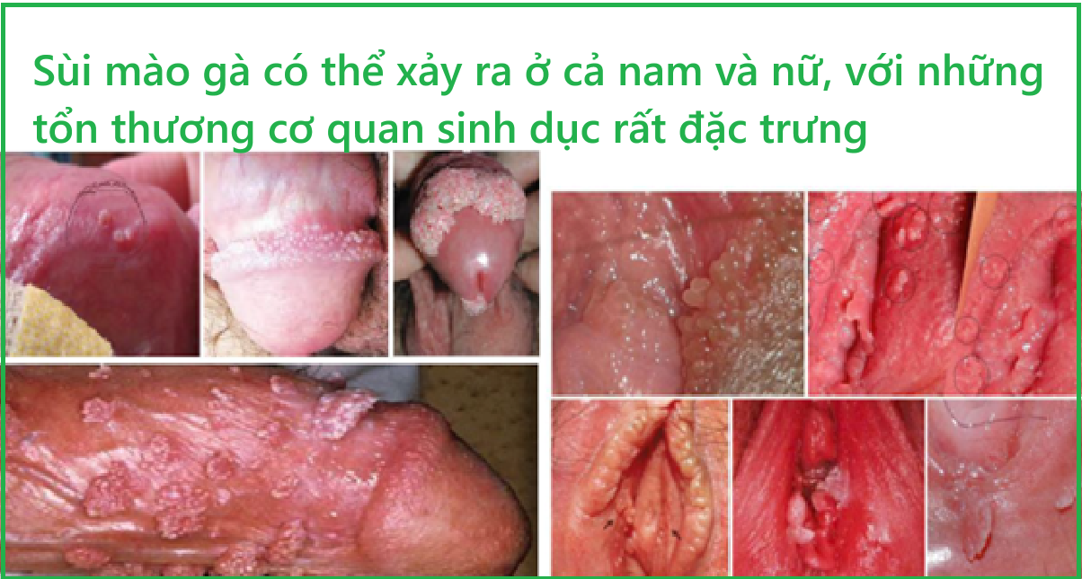 - Nam giới: tổn thương ở dương vật, rãnh quy đầu, mặt trong bao quy đầu, bùi. Tổn thương sùi mào gà ở ống hậu môn chủ yếu gặp ở nhóm quan hệ đồng tính nam MSM. Ngoài ra, bệnh có thể xuất hiện cả ở môi, miệng, họng do dùng miệng quan hệ tình dục.
