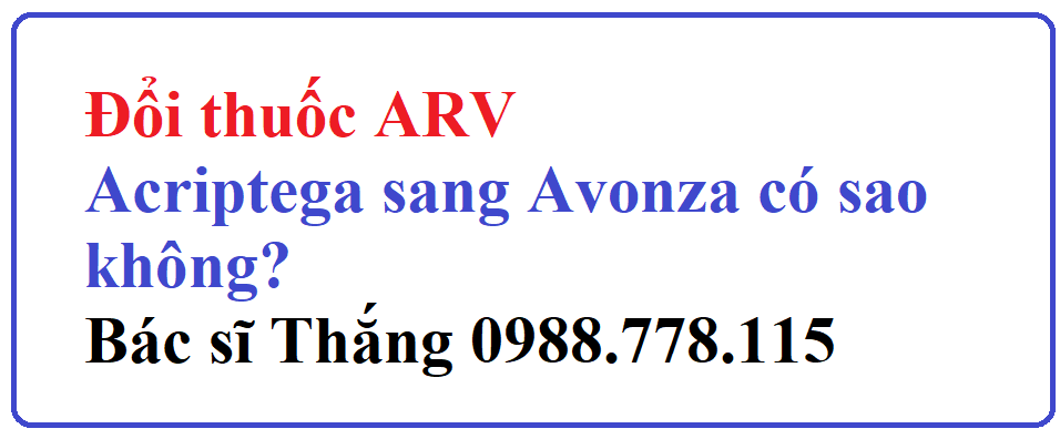 Về lí thuyết, các thuốc ARV cùng phác đồ ARV bậc 1 đều có thể đổi cho nhau. Chỉ khác là thuốc Acriptega mà cứ đổi sang loại khác thì khiến nhiều người bị dị ứng. Có rất nhiều bệnh nhân đổi từ Avonza, hoặc các thuốc ARV khác như Eltvir, Trustiva, Trioday, TLE M152...sang thuốc Acriptega không sao. Nhưng đang uống quen Acriptega đổi sang Avonza lại bị co giật, dị ứng, thậm chí là sốt cao 40 độ C.