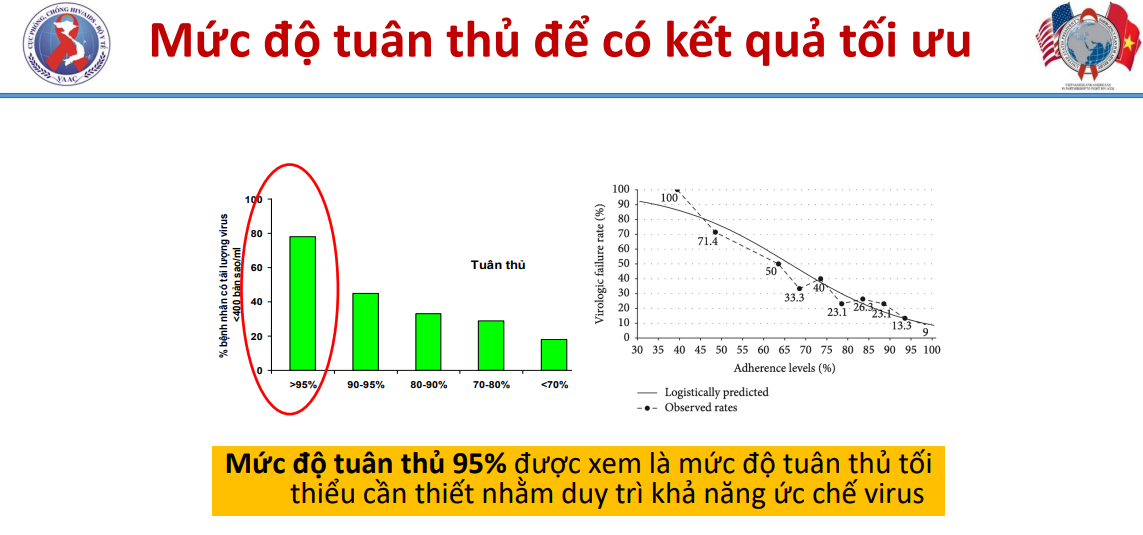 Mức độ tuân thủ trên 95% được coi là mức tối thiểu để duy trì ổn định ngưỡng tải lượng virus dưới 40 bản sao/ml. Đó cũng là chỉ số nói lên khả năng xuất hiện đột biến kháng thuốc ARV là thấp nhất (theo nghiên cứu của George Gachara tại Nam Phi).