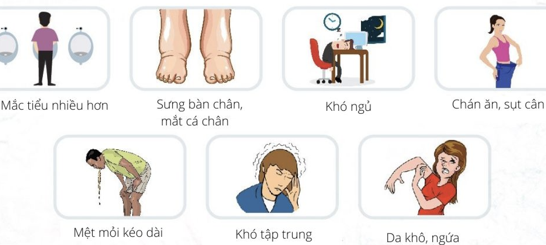 Tuy nhiên, đến giai đoạn muộn, chúng ta có thể bắt gặp các biểu hiện rõ ràng hơn. Chẳng hạn như thiếu máu, loãng xương, mệt mỏi nhiều, phù chân, rụng tóc, tiểu nhiều bọt...