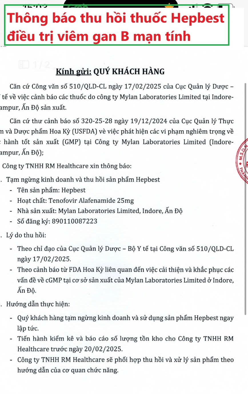 Thuốc Hepbest tốt là một chuyện, việc thu hồi thì vẫn phải tiến hành theo luật định. Căn cứ Luật Dược số 105/2016/QH13 ngày 06/4/2016; Căn cứ Thông tư số 45/2024/TT-BYT ngày 24/12/2024 của Bộ Y tế về việc sửa đổi, bổ sung một số điều và phụ lục kèm theo Thông tư số 11/2018/TT-BYT ngày 04/5/2018 của Bộ trưởng Bộ Y tế quy định về chất lượng thuốc, nguyên liệu làm thuốc; Căn cứ thư cảnh báo số 320-25-28 ngày 19/12/2024 của Cục Quản lý Thực phẩm và Dược phẩm Hoa Kỳ (USFDA) về việc phát hiện các vi phạm nghiêm trọng về thực hành tốt sản xuất (GMP) tại Công ty Mylan Laboratories Limited (Indore-Pithampur, Ấn Độ); Căn cứ công văn số 510 của cục quản lý dược - Bộ y tế, nhiều công ty đã chính thức thông báo thu hồi sản phẩm thuốc Hepbest. Với những thuốc Hepbest sản xuất tại Công ty Mylan Laboratories Limited (Indore-Pithampur, Ấn Độ). Số đăng ký: 890110087223.