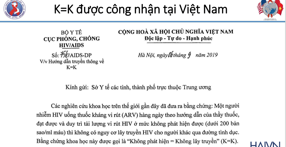Theo công văn số 756/AIDS-DP của Cục phòng chống HIV/AIDS, Việt Nam công nhận thông điệp K = K từ ngày 06/09/2019. Điều này có được là do Việt Nam đã tiếp thu những kết quả đáng khích lệ từ thế giới. Rất nhiều công trình nghiên cứu về tính hiệu quả của K = K đã được thực hiện trên toàn cầu. Theo đó, 100% số trường hợp có tải lượng HIV-RNA âm tính khi quan hệ không dùng bao cao su, vẫn không lây bệnh cho bạn tình.