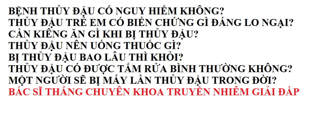 Thủy đậu là bệnh gì, có nguy hiểm không, có biến chứng gì không? Khi bị thủy đậu có cần kiêng ăn gì không, có được tắm rửa bình thường không? Triệu chứng của thủy đậu như thế nào, làm sao để chẩn đoán thủy đậu? Cách điều trị thủy đậu tại nhà? Bệnh thủy đậu có lây không? Mỗi người sẽ bị mấy lần thủy đậu trong đời? Cách phòng chống bệnh thủy đậu tốt nhất là gì? Những quan niệm sai lầm nào hay gặp phải khi bị thủy đậu?