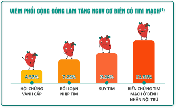 Theo những nghiên cứu mới đây, viêm phổi cộng đồng làm gia tăng nguy cơ biến cố các bệnh lý tim mạch rõ ràng. Ví dụ, viêm phổi cộng đồng làm tăng nguy cơ mắc hội chứng vành cấp lên đến 4,52%. Và đặc biệt là với nhóm bệnh nhân có bệnh lý tim mạch nội trú thì nguy cơ tăng lên gấp hơn 13% khi mắc viêm phổi cộng đồng.