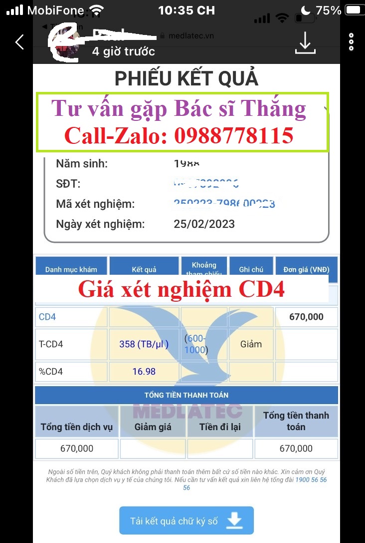 Như vậy, xét nghiệm đếm số lượng tế bào CD4 có giá 670.000vnd tại viện Medlatec. Những cơ sở y tế khác có giá thấp hơn một vài trăm nghìn.